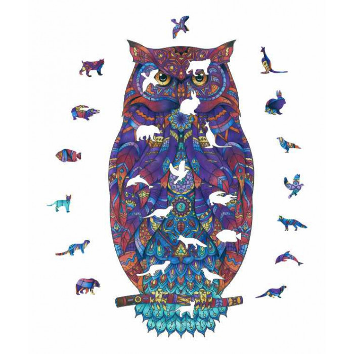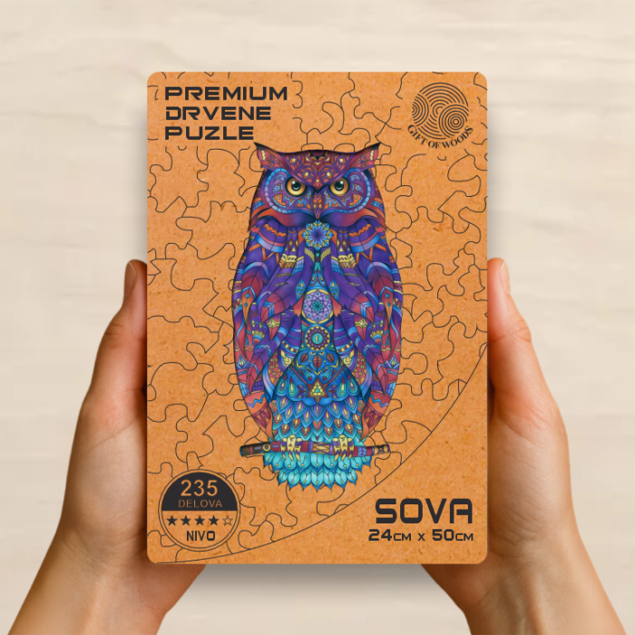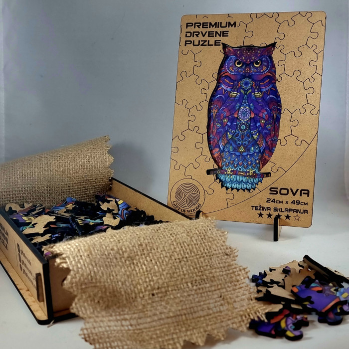 Drvena puzla Sova predstavlja spoj prirodnog drveta, umetnosti i snažne simbolike. Svaki deo je precizno sečen i posebno oblikovan kako bi slaganje bilo izazovno, smirujuće i vizuelno impresivno.
