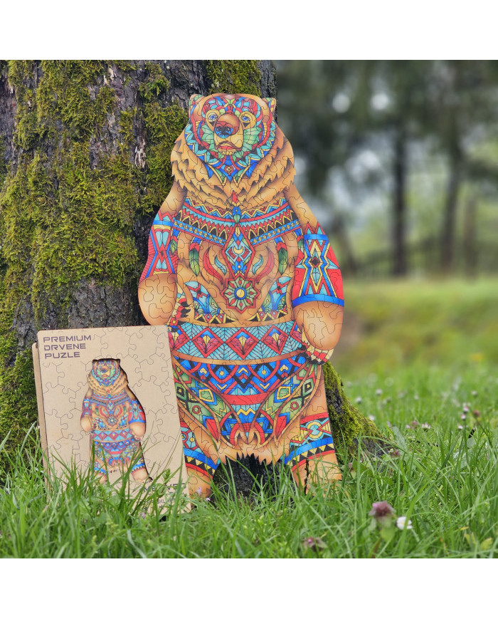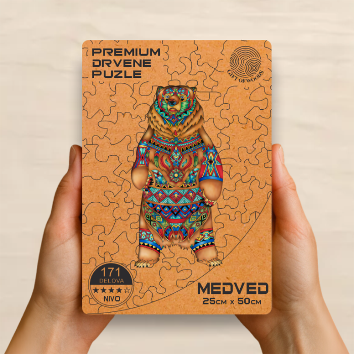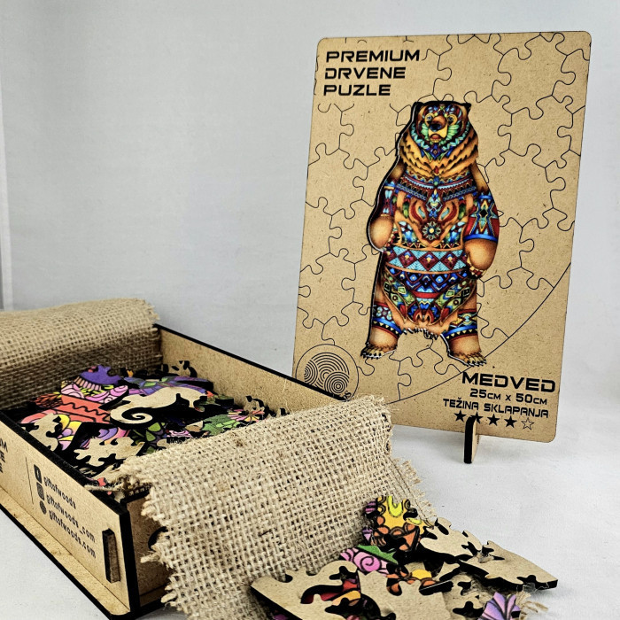 Drvena puzla Medved predstavlja spoj prirodnog drveta, umetnosti i snažne simbolike. Svaki deo je precizno sečen i posebno oblikovan kako bi slaganje bilo izazovno, smirujuće i vizuelno impresivno.