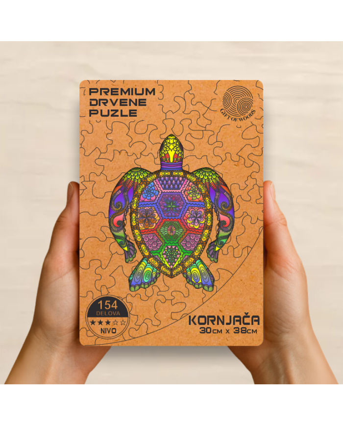 Drvena puzla Kornjača predstavlja spoj prirodnog drveta, umetnosti i snažne simbolike. Svaki deo je precizno sečen i posebno oblikovan kako bi slaganje bilo izazovno, smirujuće i vizuelno impresivno.